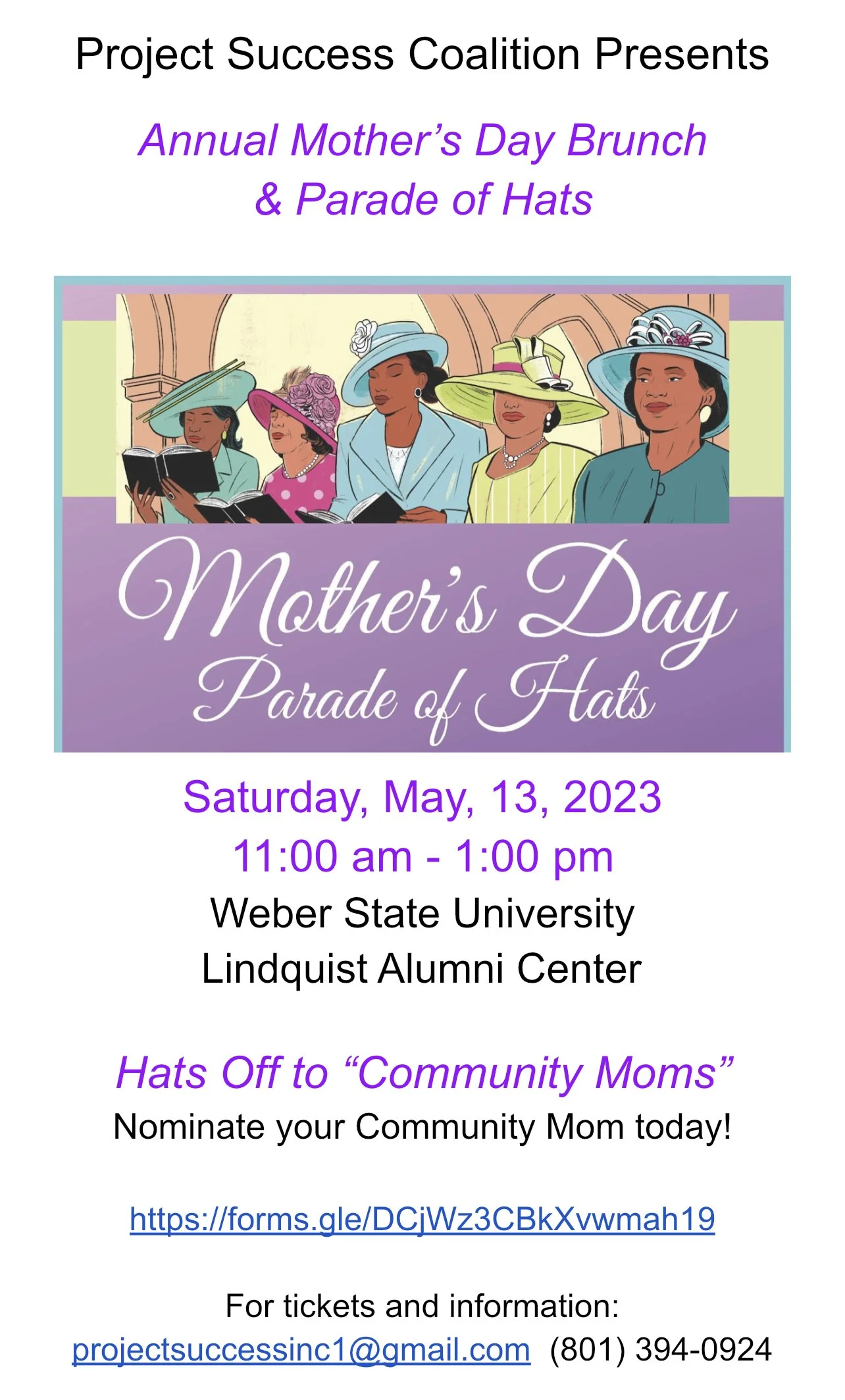 Mother’s Day Brunch & Parade of Hats Saturday, May 13, 2023 11:00 AM 1:00 PM Weber State University- Lindquist Alumni Center 1299 Edvalson Street Ogden, UT, 84408 United States (map) Google Calendar ICS